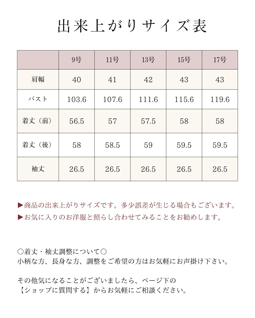 ▶︎9号:肩幅40/バスト103.6/着丈(前後)56.5、58/袖丈26.5
